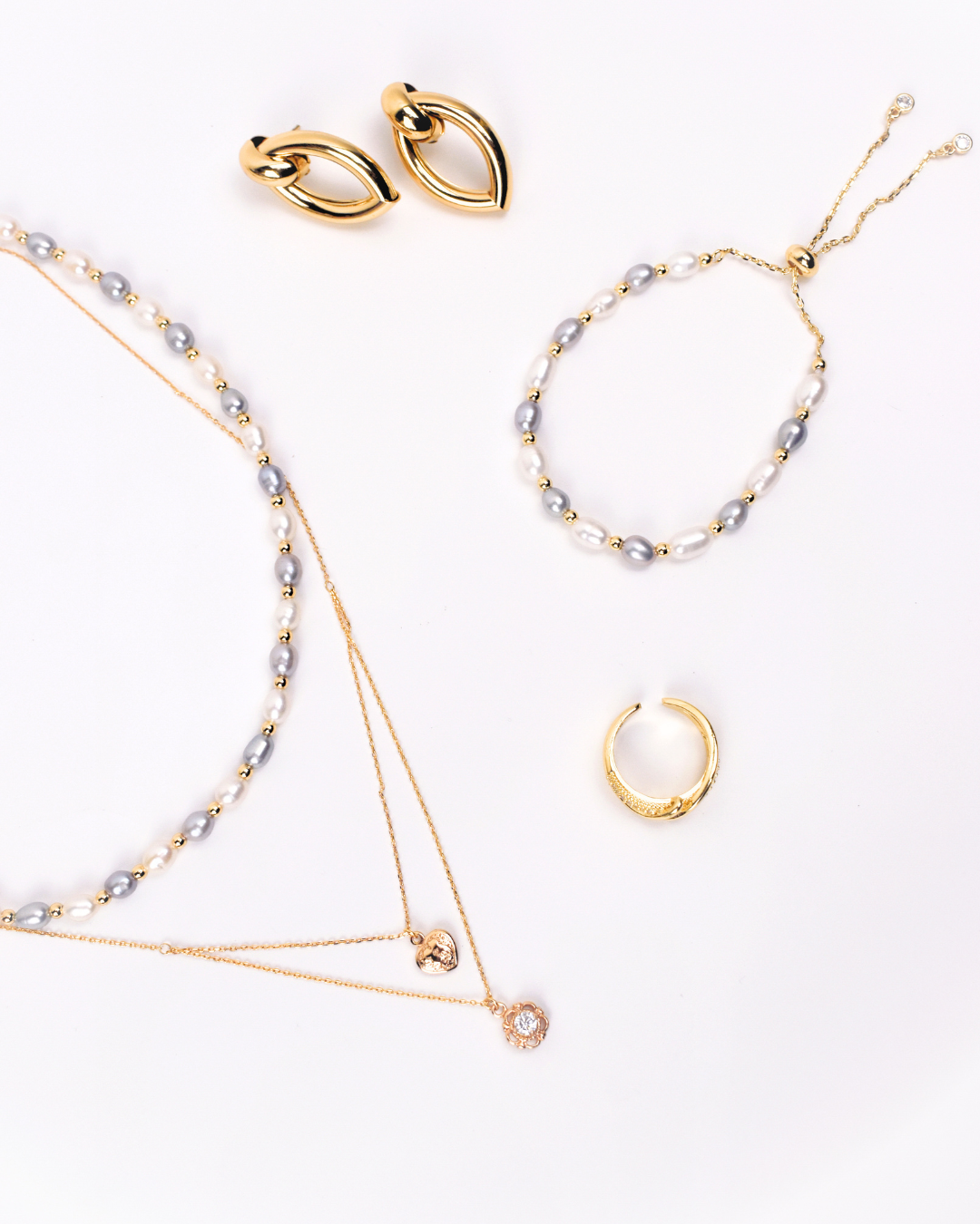 Halo White Pearl Necklace and Bracelet with Gold Heart Necklace